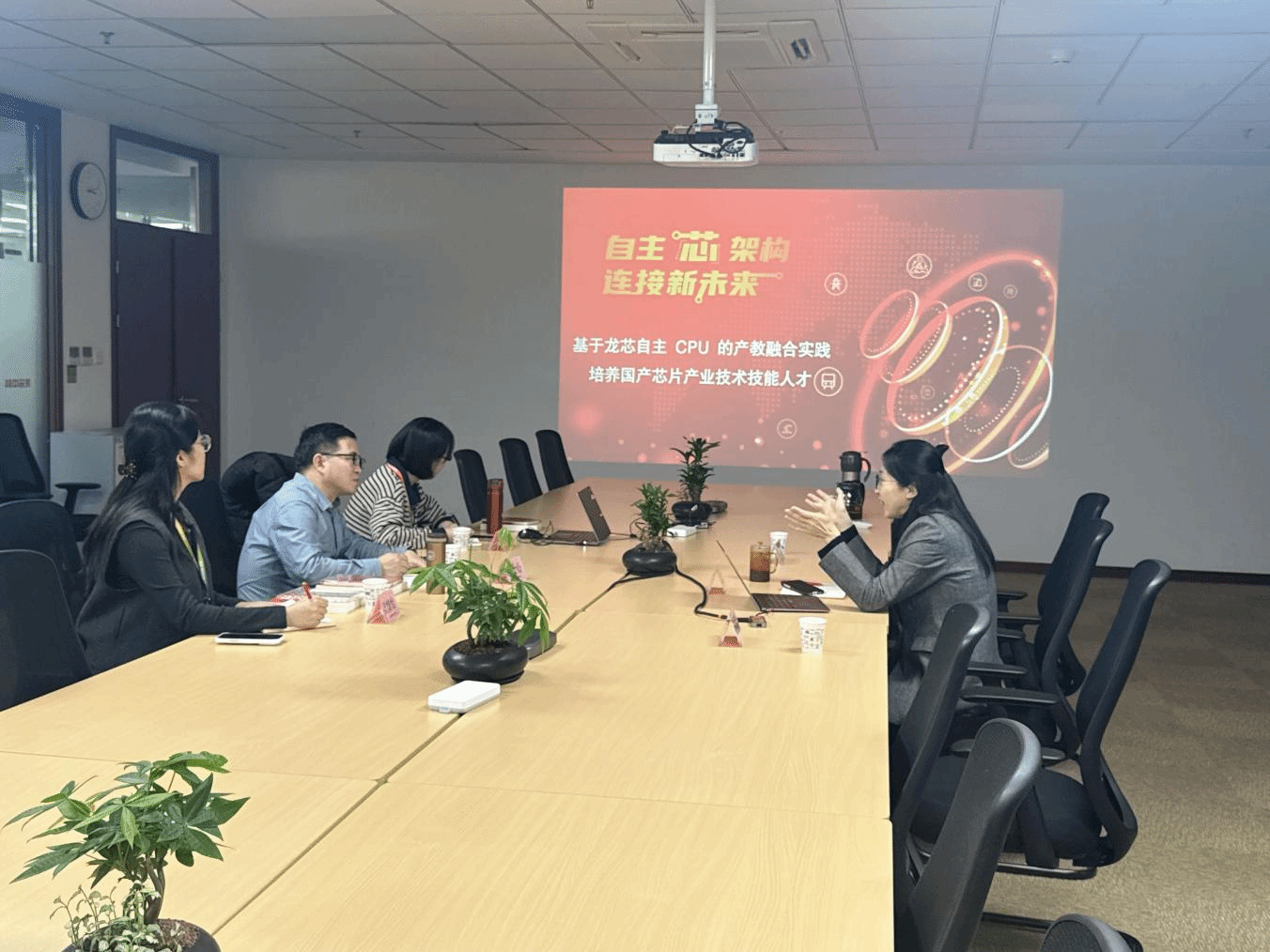 调研期间,学院一行首先参观了龙芯中科展厅,通过实地察看、现场讲解,详细了解了龙芯中科在自主CPU研发、核心技术突破、生态体系建设及产业化应用等方面取得的标志性成果。在随后举行的座谈会上,杜安利结合国家“十五五”规划与产业发展趋势,系统阐述了龙芯在技术创新、产业协同、人才培养等方面的战略布局。李士心介绍了电子工程学院在学科建设、人才培养、科研平台等方面的现状与规划,并表示期待通过校企合作,共同培育符合国产芯片行业需求的高素质人才。双方围绕产教融合、科技成果转化等合作领域进行了务实交流,并达成初步共识。